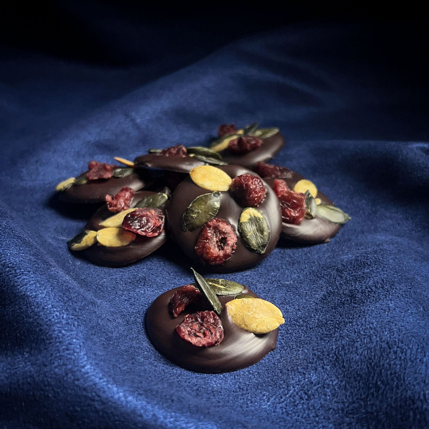 Le grand classique : le mendiant gourmand, palet de chocolat surmonté de canneberge et de graines de courge toastées
