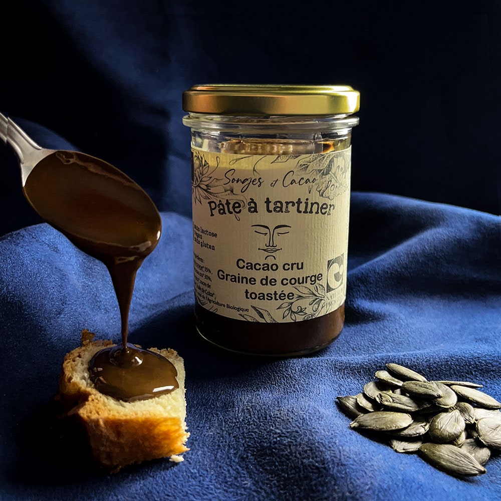 Ma nouvelle pâte à tartiner, subtile alliage du cacao cru et des arômes des graines de courges toastées… Même pas la peine d’acheter du pain, vous risquez de la manger à la cuillère…
